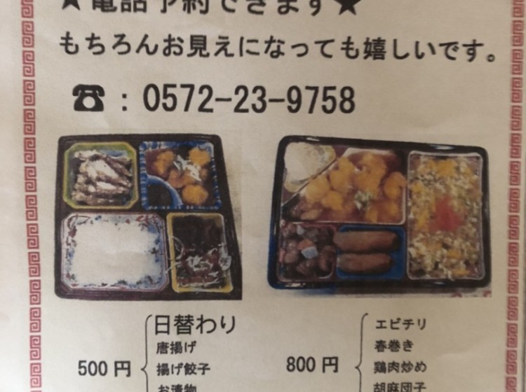 ・B弁当 800円(チャーハン弁当)などのメニューがございます。