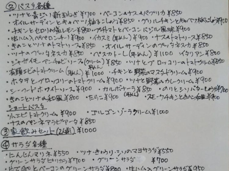 ②パスタ各種700円〜などのメニューがございます。