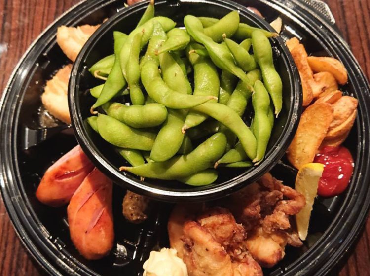 ☆ボリューム満点の弁当。肉盛りセット(牛タン・豚角煮・唐揚げ・フライドポテト・そーセージ・えだまめ)はつまみやおかずにどうぞ。